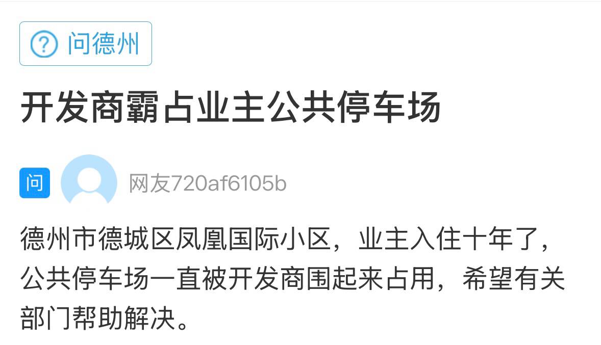 真孝善·闪电新闻1月21日讯 德州的一位网友在闪电新闻网络问政平台留言说:德城区凤凰国际小区,业主入住十年了,公共停车场一直被开发商围起来占用。希望有关部门..